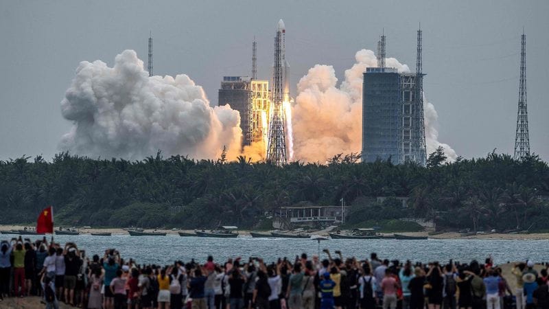 中国・海南省の文昌発射場から、有人宇宙ステーションのコアモジュールを積んで打ち上げられる大型ロケット「長征5号」=2021年4月29日、中国・海南省