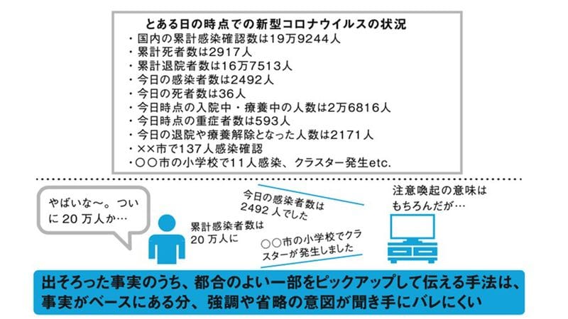 プロパガンディストたちが使うハイピングは、この認知の性質を利用し、事実の中の一部を捻じ曲げる、誇張する、有利な証言だけを強調するなどして、人々を動かしてしまうダークなテクニック。彼らが巧妙なのは、聞き手の聞きたいと願っている情報を事実の中に紛れ込ませていくところです。