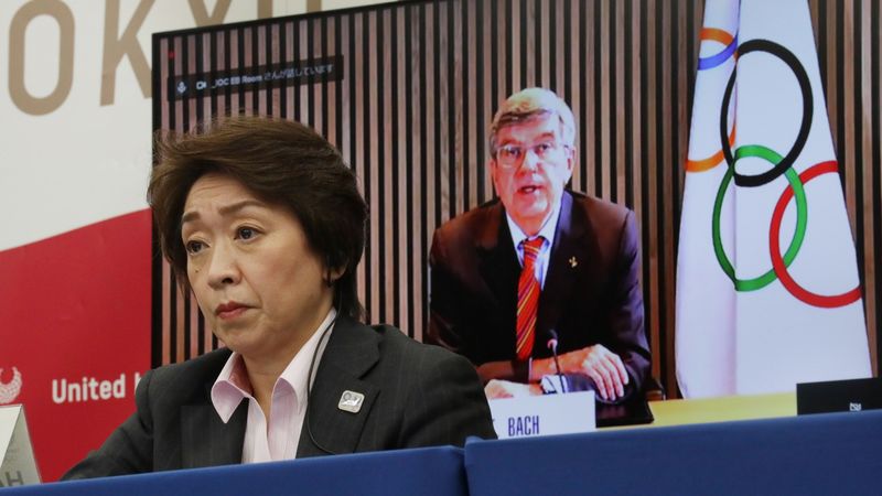 東京五輪・パラリンピックに向けた5者協議で国際オリンピック委員会(IOC)のトーマス・バッハ会長(後方モニター)のあいさつを聞く大会組織委員会の橋本聖子会長=2021年3月3日、東京都中央区