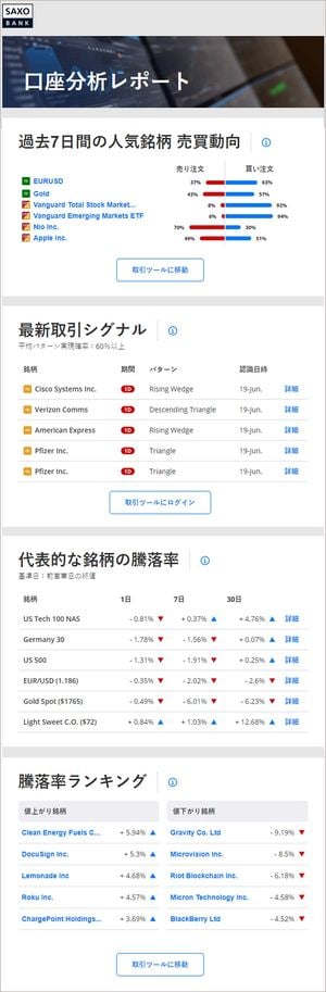 2つめは、世界170カ国、80万人を超えるサクソバンクグループの顧客売買動向や取引シグナルなどを配信する「口座分析レポート」だ。売買傾向をビッグデータ解析し、顧客一人ひとりに合った銘柄を提案するレコメンドサービスが特徴。国をまたがる顧客の売買動向はグローバルに事業を展開するサクソバンクグループならではの貴重な情報だ。