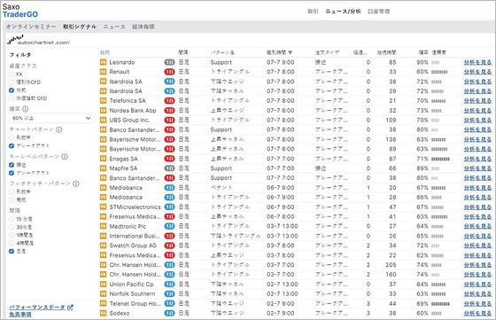 1つめは、米オートチャーティスト社が開発した自動分析ツール「オートチャーティスト™」の「取引シグナル」。最新のアルゴリズムを用いてテクニカル分析を行い、最適な売買タイミングを取引シグナルとして通知するサービスだ。自社取引ツール「SaxoTraderGO」に組み込まれているため、お気に入り銘柄を登録しているウォッチリストにも取引シグナルが表示される。タイミングのいい売買はもちろん、保有株のリスク管理にも役立つ。