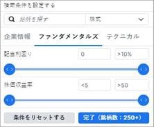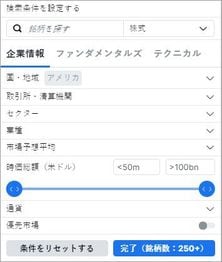 4つめは、指定した条件に合致する銘柄を抽出するSaxoTraderGOの「スクリーナー」。国や取引所、セクター、業種、アナリストによる平均評価、配当利回り、株価収益率、期間別の株価変動率など、様々な切り口で銘柄検索が行える。