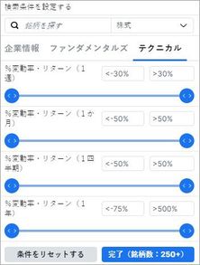 「企業情報」「ファンダメンタルズ」「テクニカル」のテーマごとに多様な条件で銘柄検索が可能な「スクリーナー」。米国株取引が初めてなら、配当利回りや株価収益率、期間別の株価変動率などで検索して日本株と比べてみよう。米国株のダイナミックな値動きや収益チャンスの大きさを実感できるはずだ。
