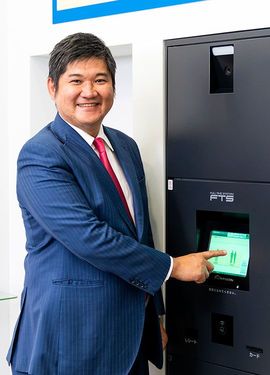日本初の顔認証サービス「F-ace」(フェイス)式ロッカーの前で。また 在宅勤務が一般的になり、書類や備品の受け渡しに利用できる、職場 のコンピュータ式ロッカー「Fulltime@box」サービスが注目されている。