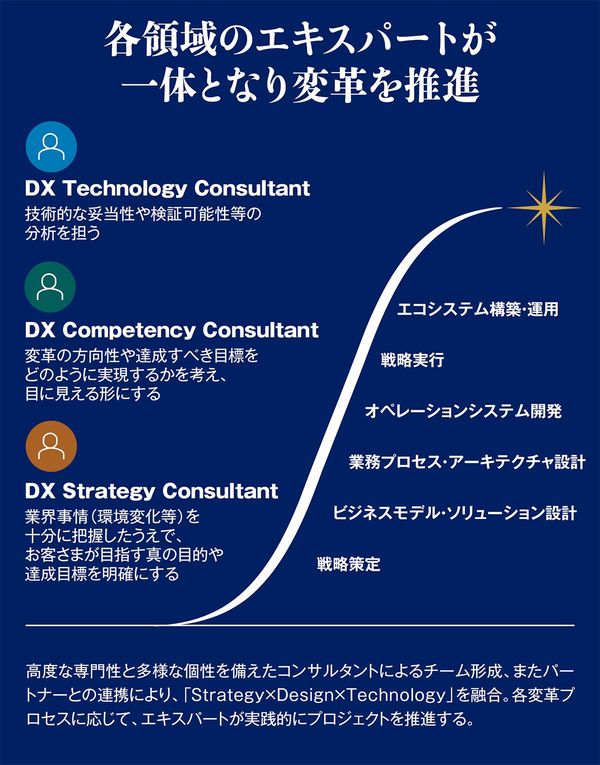 【今井】DXを推進するには、戦略策定、戦略を実現するビジネスモデルや業務プロセスの設計、システムの開発、さらにその運用などの段階があります。当社では各領域の知見、専門性を備えたコンサルタントがチームを組み、「Strategy×Design×Technology」を融合させた形でサポートを行います。着実に山を登っていくには、この三つを同時に見極めることが重要。それによって、各段階に存在する質の異なる障壁を効率的に乗り越えていくことが可能になります。