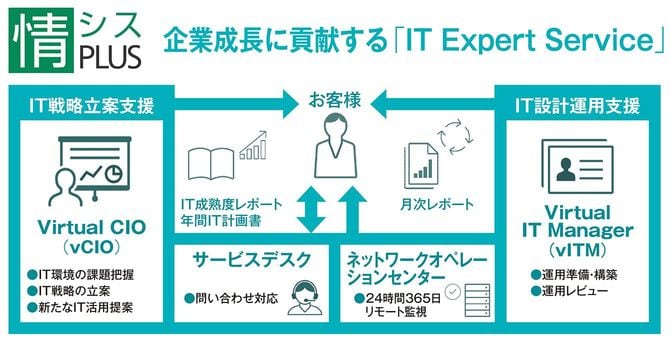 同社では、今回紹介した「IT Expert Service」のほか、多様なIT機器の運用・保守に軸足を置き、トラブルの早期解決を支援する「ITあんしん プレミアム」も提供している。お客様のニーズに合わせたこれら二つのITアウトソーシングサービス「情シスPLUS」でお客様の企業成長をITの領域から支援していく気構えだ。