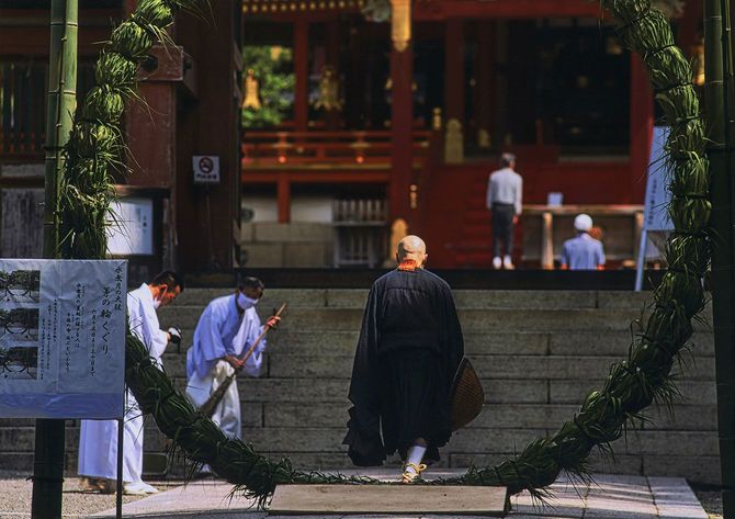 【大嶋】今や、ホタルの姿を見られる場所は限られています。佳作1の「上陸開始」ではたくさんのホタルによる鮮やかな光、暗闇のコントラストが美しいですね。ただそれだけでなく、背景にある「人間による自然への配慮や努力」も含めた「共存」がうまく表現されているのかなと思います。佳作2の「お坊さんも神だのみ」は、ここ日本では仏教も神道も身近な場所にあるという様子を、奥行きのある写真として捉えている点が目を引きます。当社が目指している「共存社会」のイメージとも重なり選出しました。