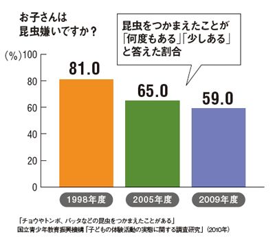 #自然・環境 2010/11/18 0:00 チョウやバッタを捕まえた経験がない小中学生が4割 プレジデント ファミリー この10年で子供たちの「虫離れ」は進み、2割から4割に。カブトムシはもちろん、セミやアリすら触れない子がいると教育関係者は嘆く。外遊びが減っているし、そもそも野原自体少ないので、蚊やゴキブリなど一部の虫しか見ない。虫=「害虫」のイメージ? ランキング 1位 「日本の新幹線」を売らずによかった…「貸した金が返ってこない」習近平がハマったインドネシア新幹線の泥沼 ランキングをもっと見る ライフ #自然・環境