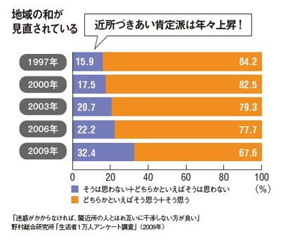 #コミュニケーション 2010/11/18 0:00 近所づきあいを望む人がここ3年で10ポイント増 プレジデント ファミリー 意外なことに、隣近所とのつきあいを望む声が年々高まりつつあるという結果が出た。独居老人の孤独死や児童虐待などが相次ぎ社会問題化する中で、地域や人とのつながりを重視する人が増えているのだろう。願わくばお隣さんも同じ気持ちでいてくれますように。 ランキング 1位 命にかかわる決断を3秒で下した…脳出血で倒れた出口治明に「自力で歩くこと」を諦めさせた理学療法士の言葉 ランキングをもっと見る ライフ #コミュニケーション