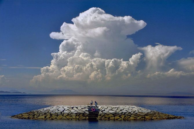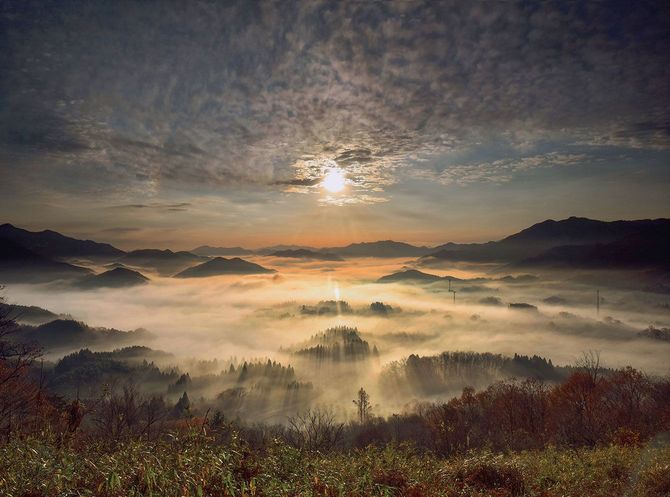 【鈴木】優秀賞「明け渡る大地」は、明智光秀が城と町を築いた京都・福知山市の雄大な光景を、光と霧の演出によって描き出した一枚。歴史のロマンを感じさせると同時に「現代に生きる私たちに自然は何を語りかけているのか」と考えさせられました。佳作の「夏日」は、海と空の青と、雲や岩場の白との対比が面白く、自然の「視線」をも感じるようです。もう一点の佳作「メルヘンの唄」で雲、光、澄んだ空気が音楽を奏でているような光景には、ずっと眺めていたいと思わせる魅力があります。