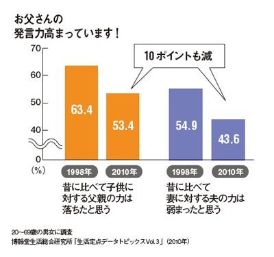 #コミュニケーション 2011/03/18 0:00 妻や子供への父親の力が強まっていると感じる人が増加 プレジデント ファミリー ここ10年ちょっとで家庭における父親や夫の存在感が増しつつあるという。家事や育児など男性への期待が高まる中でのこの数値、日頃の頑張りはちゃんと評価されている。家庭で居場所がない、影が薄いなどと言われたのも今は昔。頼りにしてます、お父さん! ランキング 1位 「男性だらけの会議」では絶対に気づかない…女性自衛官が災害現場で真っ先に提案した“2つの生活必需品” ランキングをもっと見る ライフ #コミュニケーション