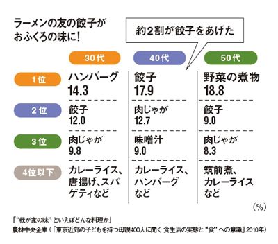 #食品 2011/03/18 0:00 40代主婦のわが家の味は「餃子」「肉じゃが」「味噌汁」 プレジデント ファミリー お母さん400人に聞いたわが家の定番料理が、世代でかなり異なることが判明した。ハンバーグや唐揚げがランクインする30代に対し、50代では筑前煮や野菜の煮物。どの世代でも共通のメニューは餃子と肉じゃがだ。この背景にあるのは子供の年齢? 夫の好み? ランキング 1位 42度でも、39度でもない…7万人調査でわかった「老後のヨボヨボ化を防ぐ」医学的に正しい"お風呂の温度" ランキングをもっと見る ライフ #食品