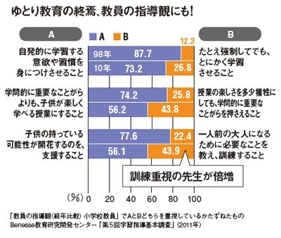 #習慣 2011/04/18 0:00 小学校教員が授業で「楽しさ」より「訓練」を重視する傾向に プレジデント ファミリー 教員の指導観はこの12年で変わりつつあるようだ。授業や生活指導において、子供の自発性や学びの楽しさよりも学力向上を重視するなど訓練的な傾向が強まっている。ゆとり教育からのシフトチェンジともいえるこのデータ、親にとっては歓迎すべきか憂慮すべきか。 ランキング 1位 だから南極では誰も「白いTシャツ」を着ない…南極観測隊員が「色のついた服」しか持っていかない切実な事情 ランキングをもっと見る ライフ #習慣