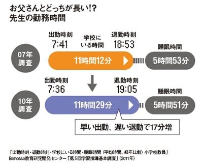 #時間管理 2011/04/18 0:00 小学校教員が平日学校にいる時間は平均11時間半と増加中 プレジデント ファミリー 教員が学校にいる時間は3年前より17分増加。別の設問で、教材準備の時間がとれない、事務書類の作成が多いなど教員の悩みも明らかになった。今年度からは小学校で新学習指導要領が全面実施され、さらに忙しくなりそう。保護者はこの働きぶりをどう評価する? ランキング 1位 食事前に胃に入れておくだけで血糖値の急上昇を防げる…専門医が「常備」を勧める手軽な食材4つ ランキングをもっと見る キャリア #時間管理