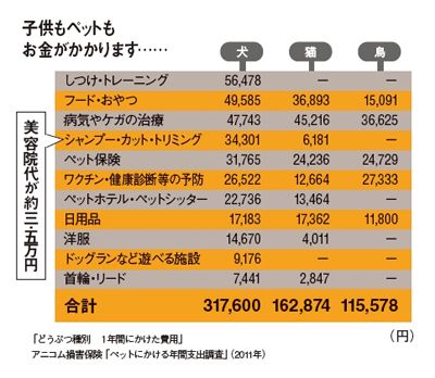 #年収・給料 2011/04/18 0:00 ペットにかかる年間支出犬は31万円、猫は16万円、鳥は11万円 プレジデント ファミリー ペットで一番費用がかかるのは、エサ代ではなく、犬ではしつけ料、猫と鳥では病気などの治療費。犬の場合はトリミング代や洋服代などもあり、トータルで猫の倍近い。教育費と医療費の出費を惜しまず愛情を注ぐ飼い主の姿は、子を思う親とまったく同じようだ。 ランキング 1位 やはり厚生年金は割が悪すぎる…厚労省がひた隠しにする「ねんきん定期便」に極小の字で書かれる不都合な真実 ランキングをもっと見る マネー #年収・給料