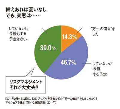 #東日本大震災 2011/05/18 0:00 地震後も防災グッズや非常食を備えるつもりのない人は約4割 プレジデント ファミリー 東日本大震災から2カ月余り。震災前から防災グッズ等を備えていた人以外に聞いたところ、39%が今後も備える予定なし。本調査は震災の約10日後に行われたため、する予定と答えた人も実際やったかどうかは不明。「喉元過ぎれば熱さを忘れる」では困るのだが。 ランキング 1位 今川義元でも、斎藤道三でも、徳川家康でもない…20代の織田信長が最も信用できなかった"武将の名前" ランキングをもっと見る ライフ #東日本大震災