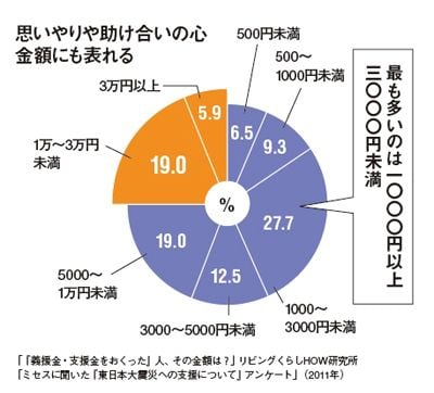 #東日本大震災 #年収・給料 2011/06/18 0:00 東日本大震災で義援金などを送った妻4人に1人が1万円以上 プレジデント ファミリー 未曽有の大惨事となった東日本大震災。義援金や支援金を送った既婚女性に聞くと、平均金額は1万1241円。1万円以上3万円未満が19%、3万円以上が5.9%と、日頃節約に励むわりには太っ腹といえるのでは。復興に向け、これからも我々の本気度が試される。 ランキング 1位 過去最高売上のディズニーの中で「一人負け」…舞浜駅前の商業施設が「一等地なのにいつもガラガラ」なワケ ランキングをもっと見る マネー #東日本大震災 #年収・給料