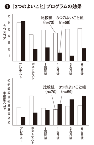 アメリカの心理学者セリグマン博士(ペンシルバニア大学教授、前アメリカ心理学会会長)は、うつの改善に役立ち、しかも驚くほど簡単なプログラムを提唱している。それはthree good thingsといわれるもので「まいにち、就寝前に、その日にあった『よいこと』を3つ書き出し、これを一週間続ける」というものである。この簡単な方法がうつの改善に驚異的な効果を発揮するのである。
