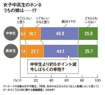 #結婚 2011/06/18 0:00 お父さんのような男性と結婚してもいい女子中学生26%、女子高生30% プレジデント ファミリー 娘を持つ世のお父さんたちはこのデータをどう見るか。父親のような男性と「すごく結婚したい」感心な娘は1ケタと少数で、「絶対イヤ」な親不孝娘が半数近い。でも高校生では「すごくしたい」「してもいい」の割合がともに増加。ここは寛大に娘の心の成長を待とう。 ランキング 1位 秋篠宮家とも三笠宮家とも全然ちがう…「愛子天皇」待望論の背景に"家族関係のお手本"求める国民感情【2025年12月BEST】 ランキングをもっと見る ライフ #結婚