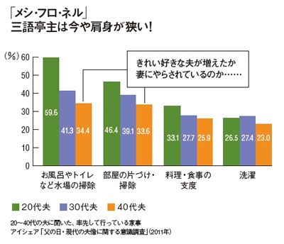 #習慣 2011/08/18 0:00 40代夫が率先して行う家事風呂トイレ掃除は34%、食事の支度26% プレジデント ファミリー 既婚男性が自ら答えた家事への貢献。風呂やトイレの掃除、部屋の片づけを日常的に行う夫は案外少なくない? 特に20代夫の活躍ぶりは目を見張るばかり。最初、この数値を見て年末の大掃除と勘違いした私。すぐさまわが家の40代夫に見せたのは言うまでもない。 ランキング 1位 42度でも、39度でもない…7万人調査でわかった「老後のヨボヨボ化を防ぐ」医学的に正しい"お風呂の温度"【2026年1月BEST】 ランキングをもっと見る ライフ #習慣