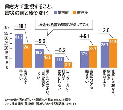 #東日本大震災 #年収・給料 2011/09/18 0:00 震災後、「出世」「高収入」「自己実現」を求める人が減少 プレジデント ファミリー 震災による意識の変化は働き方にも表れ、仕事のやりがいや他者からの評価よりも家族との時間を重視する傾向に。今まで当たり前と思っていたことは実はかけがえのないものだった――。この学びと、犠牲になった多くの命は、復興が進んでも深く胸に刻んでおきたい。 ランキング 1位 このままでは日本車も半導体も作れなくなる…日本が誇る基幹産業を"人質"に取った習近平の「最大の切り札」【2026年1月BEST】 ランキングをもっと見る マネー #東日本大震災 #年収・給料 #出世