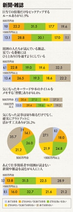 情報収集に関しては、いかに余計なものをカットするかに尽きる。抱え込まなくても、必要なときに必要な情報を見つけられればいいのだ。そう思って見てみると「目当ての情報だけをピックアップするルールがある」「気になったキーワードや本のタイトルをメモする習慣がある」という項目にあてはまる人は、それぞれ41.9%対31.2%、44.4%対27.7%と年収1500万円以上が500万円台よりかなり多いのがわかる。あふれる情報にただ振り回されていたら、高い収入は望めない。