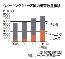 実際、矢野経済研究所のマーケット調査でもトーニングシューズの国内出荷数量が、09年の67万足から10年には193万足と爆発的に増えた。今年も伸び率こそ鈍化しているが、数量は約2倍の351万足と予想される。スニーカーなどの苦戦を横目に、ウオーキングシューズ全体がわずかながらも伸長しているのは、トーニングシューズが底上げしているからにほかならない。