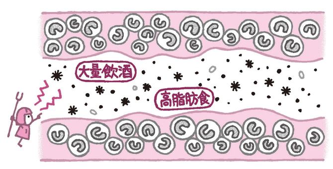 日頃から食事に気をつけていると、上の図のように、腸内細菌の善玉菌と悪玉菌のバランスが良好に保たれて、粘膜の表面もきれいです。血液中の免疫細胞は、何ごとも起こらないときも見張ってくれています。
