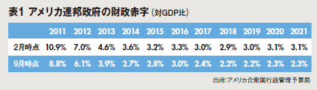 アメリカでは、国債残高の上限の期限を迎え、財政再建を議論するスーパー・コミッティにおいて民主党と共和党が物別れとなったままである。アメリカの財政再建の行方は世界的なソブリン危機のリスクに深く関わる。そのヒアリングのためにワシントンを訪れた。先の9月に、アメリカ行政管理予算局は、2011年2月の推計を修正し、財政赤字の今後の計画を大きく改善させる数字を公表した(表1)。11年に対GDP比で8.8%(11年2月の時点では10.9%)、12年に6.1%(11年2月の時点では7.0%)、13年に3.9%(11年2月の時点では4.6%)、14年に2.7%(11年2月の時点では3.6%)と財政赤字が縮小することになる。