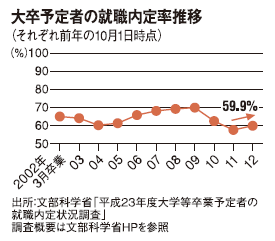 今春卒業予定の大学生の就職内定率は59.9%(2011年10月1日時点)で、過去2番目の低さだった。この結果は悲観的に語られがちだが、人材コンサルタントの常見陽平氏は「むしろ、前年同期より上がっていることに注目すべき。震災はあったが、大企業を中心に採用予定数は回復傾向にある」と分析する。