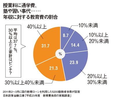 #年収・給料 #教育 2012/01/21 9:00 小学生以上の子を持つ家庭の家計に占める教育費の割合は37.7%と過去最高 プレジデント ファミリー 国の教育ローン利用世帯が調査対象だが、このご時世、教育費に頭を痛める家庭は少なくないはず。年収階層別では、200万円以上400万円未満の層で57.5%と、年収の低い世帯ほど負担が大きい。日々の生活、わが子の将来、自分の老後、どれも大事なのだが……。 ランキング 1位 仲人「"優しい彼氏"が一番怖い」…年収や学歴ではわからない、結婚したら「モラハラ夫」に化ける男性の口癖 ランキングをもっと見る マネー #年収・給料 #教育