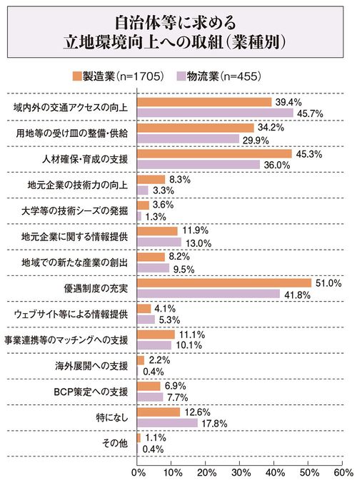 同じ日本立地センターの調査によれば、企業が「自治体等に求める立地環境向上への取組(業種別)」は下図のとおり。上位の「優遇制度の充実」「域内外の交通アクセスの向上」「人材確保・育成の支援」などは、かねて重視されてきた要素に違いない。