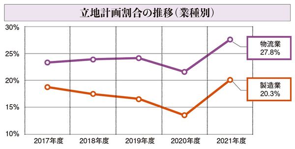「(新設・増設・移転の)計画がある」と回答した企業は、製造業で20.3%。20年度の13.7%から6.6ポイント増となった。同様に物流業は27.8%で、20年度の21.7%から6.1ポイント増えている。下図のとおり、いずれもコロナ禍前の数値を上回っており、V字回復といえる状況だ。