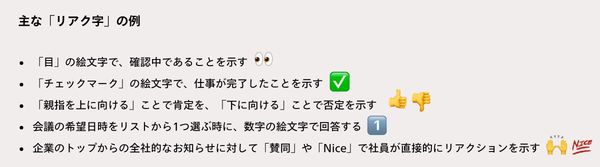 Slackでは、ユーザー企業の皆さまによって5000万以上のカスタム絵文字が作られています。この数は増加を続けており、それに伴い、絵文字の利用マナーに関するガイドラインや使用例が求められるようになりました。業務効率向上に役立つ最も一般的な例は、「絵文字リアクション」、すなわち「リアク字(リアクション絵文字の略)」です。日本では、2020年から2021年にかけて、Slack上で作成されたリアク字の数が49%増加しました。リアク字はどんなメッセージに対しても投稿でき、ワークフローを合理化するとともに、メッセージのやり取りにかかる時間も短縮します。