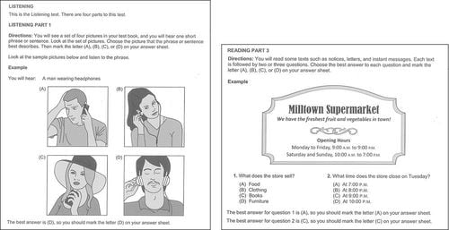 リスニング(約25分間・50問)、リーディング(35分間・50問)、合計約1時間で100問に答えるマークシート方式のテスト。リスニングの出題スピードはTOEIC L&Rよりゆっくりで、ネイティブスピーカーが「注意深く」話す際のスピード。