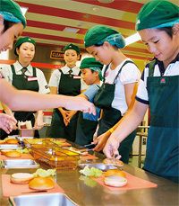 英語でハンバーガー作りをする子どもたち(東京都江東区のキッザニア東京)。(PANA=写真)