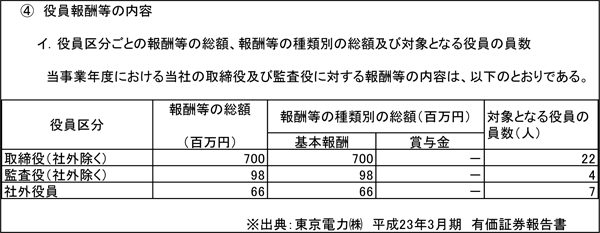 「東電では役員報酬の総額が7億円となっているだろ。支給対象の役員数が22人とあるから、単純に7億を22人で割ると一人あたりの支給額が約3181万円となる。売上高5兆円規模の上場会社の経営者にしては多いとは言えないな」