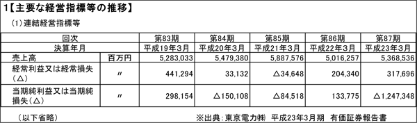 『ほんとうにいい会社が一目でわかる有価証券報告書の読み方』 #東京電力 #東日本大震災 2012/01/31 9:00 #1 #2 #3 #4 東京電力の人件費は「高すぎる」のか? PRESIDENT Online 秦 美佐子 +フォロー 公認会計士 前ページ 1 2 3 4 5 6 佑真は東京電力の有価証券報告書の『第1【企業の概況】1【主要な経営指標等の推移】』を指さした。 「うわっ、東電って平成23年3月期は1兆円もの赤字なんだね。震災が影響しているんでしょうね。でもその前の平成20年3月期と平成21年3月期も赤字なんだ。なんでだろう」 「それについてはまた次回みていこう」 以上、今回は有価証券報告書を使って電力会社の人件費を見てきました。いかがでしたでしょうか。人件費に限らず、有価証券報告書からは会社の業績背景やビジネスリスクといった様々な情報が読み取れます。 1 2 3 4 5 6 『「本当にいい会社」が一目でわかる有価証券報告書の読み方』(プレジデント社) なぜあのぱっとしない会社は不況でも増収増益なのか? 営業・就活生・個人投資家も“有報”は必読! 売上アップ、競合他社分析、投資先選定、有価証券報告書の「読み方」がわかる8つの物語。 著者 秦 美佐子 AMAZONで購入する PRESIDENT Storeで購入する 秦 美佐子(はた・みさこ) 公認会計士 早稲田大学政治経済学部卒業。大学在学中に公認会計士試験に合格し、優成監査法人勤務を経て独立。在職中に製造業、サービス業、小売業、不動産業等、さまざまな業種の会社の監査に従事する。上場準備企業や倒産企業の監査を通して、飛び交う情報に翻弄されずに会社の実力を見極めるためには有価証券報告書の読解が必要不可欠だと感じ、『「本当にいい会社」が一目でわかる有価証券報告書の読み方』(プレジデント社)を執筆。他に経営に活かせる会計をテーマにした『会計士マリの会社救出(秘)大作戦!』(すばる舎)などの著書がある。 <この著者の他の記事> マクドナルドの「復活」は本物か ランキング 1位 やっぱり高市首相の戦略は正しかった…創価学会票を当てにしたのに「小選挙区で一人負け」立憲議員の大誤算 ランキングをもっと見る ビジネス #東京電力 #東日本大震災 #自然・環境