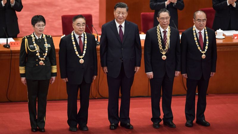 習近平国家主席はコロナ対策功労者4人に国家勲章と「人民英雄」の栄誉称号を授与。新型コロナウイルスワクチンの開発チームを率いた中国軍事科学院の陳薇氏(左)の隣にいるのは72歳の伝統医学「中医」の専門家・張伯礼院士(=2020年9月8日、北京・人民大会堂)
