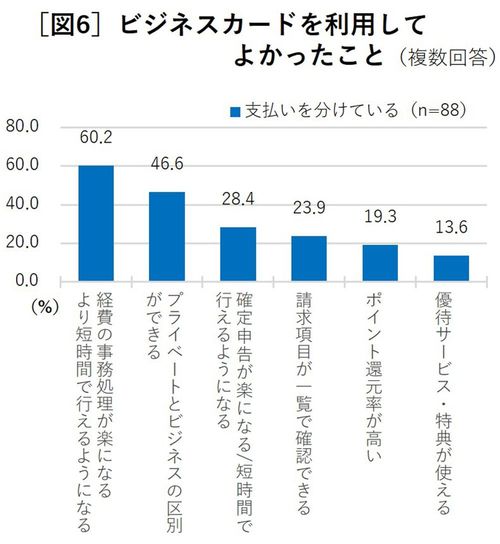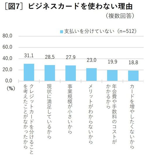 現にアンケート調査の結果を見ても、ビジネスカードをすでに利用している人にそのメリットについて質問したところ、「経費処理が楽になる」が最多(60.2%)で、「プライベートとビジネスの区別ができる」(46.6%)がそれに次いだ(図6)。一方で、ビジネスカードを使わない理由として、クレジットカードで公私の支出を分けるメリットをそもそも知らない人が多いという事情があると見られる(図7)。
