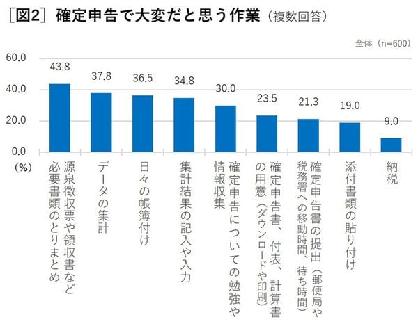 実際、「確定申告時の悩み」について尋ねた問いにも、57%以上の人が「申告書類の作成に時間をとられること」と回答している(図3)。
