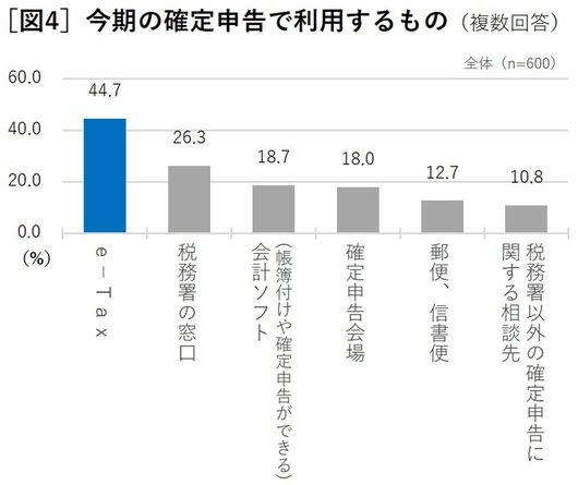 必要経費の仕分けや計上といった事前準備さえ済ませておけば、今はe-Tax(国税電子申告・納税システム)を利用すれば、申告書の作成や提出はオンラインで済ませられる。ところが、実際に同サービスを利用している人は44.7%で過半に達していないというアンケート結果が判明した(図4)。