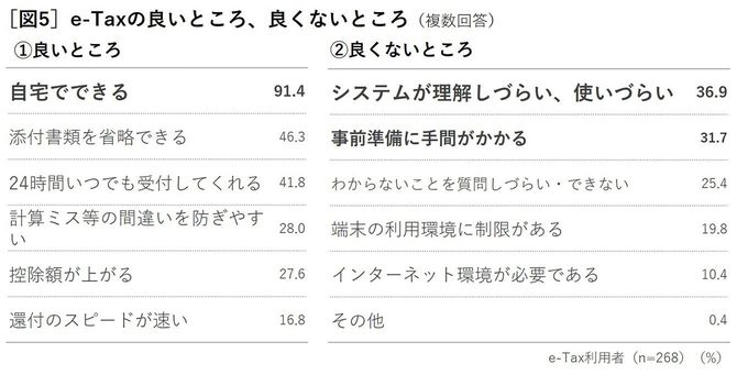 そして、e-Taxの利点については「自宅でできる」(91.4%)が最多回答となったのに対し、難点として「システムが理解しづらい・使いづらい」(36.9%)、「事前準備に手間がかかる」(31.7%)を挙げた人が目立った(図5)。