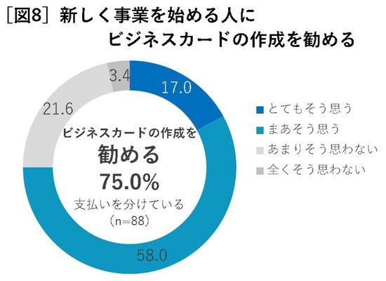 ビジネスカード利用者に「新しく事業を始める人にビジネスカードの作成を勧めるか」と聞いたところ、75%の人が勧めると回答している(図8)。やはり、ビジネスカードを使えばメリットを感じるものなのだ。