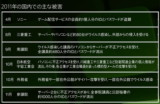 サイバー犯罪といえば、国際的な匿名ハッカー集団「Anonymous(アノニマス)」の名が、「ソニー事件」で大きく報じられた。発端は、11年1月に、米国のカリスマハッカーであるジョージ・ホッツ氏が、ソニー製のゲーム機「プレイステーション3」の改造ソフトを公表したことだった。ソニーはホッツ氏を米連邦地裁に提訴。これに対しアノニマスは「ゲーム機をハッキングするのは購入者の権利。ソニーは訴訟ではなく技術で対抗すべき」と反発。4月3日、ソニーへの攻撃を行うと宣言し、ソニーのサーバーが「DDoS攻撃」を受けた。さらに4月19日にはサーバーが不正に侵入され、約1億件の個人情報が盗み出された。