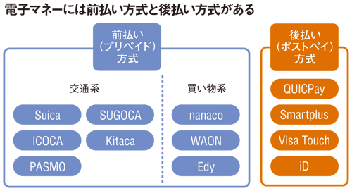電子マネーには日銀が調査対象としている前払い方式(プリペイド方式)でIC乗車券を兼ねた交通系の「Suica」「ICOCA」「PASMO」「SUGOKA」「Kitaca」などや、小売流通系の「nanaco」「WAON」、専業系の「Edy」があり、ほかにも後払い方式(ポストペイ方式)の「QUICPay 」「Smartplus」「Visa Touch」「iD」、ネット上で流通する仮想マネーなどがある。