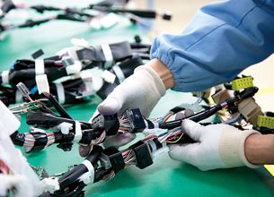 ハーネスの組み立ては手作業。目にもとまらぬスピードだ。