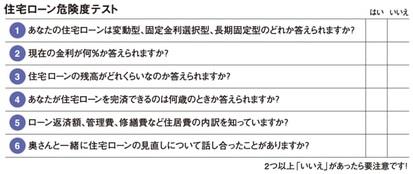 まずは下図のテストにご回答いただきたい。これは返済中のローンについての理解度を測るもので、把握できていなければ住宅ローンに潜む危険が認識できていない恐れがある。問題意識なくして改善がないのはビジネスと同じだ。