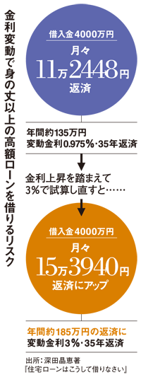 現在、新規借り入れの8~9割を変動型が占めている。変動型の金利は1%前後(金利割引後)で、仮に毎月11万円を返済できる場合、4000万円近く借りられる(図参照)。対して、3%では3000万円しか借りられない。「頭金不足でも金利の低い変動なら、欲しい物件に手が届きますよ」というセールストークで不動産会社から変動型を勧められ、安易にローンを組んでしまう罠にはまりがち。大手行は変動型の増加に危機感を募らせているが、借りる人自身こそ、金利上昇や借りすぎのリスクを認識したい。相談者の中には、「不動産会社がしばらく低金利が続くといっていたから大丈夫」「金利が上がりそうになったら固定に切り替える」という人もいる。しかし数年先の金利など誰にもわからないし、固定への切り替えも容易ではない。