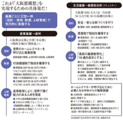 大前 今回、大阪都構想の今後の具体策を私なりにまとめてきたのでご覧ください(図表参照)。産業基盤を担う道州レベル。それから生活基盤を担う基礎自治体レベル。それぞれが何をすべきか、「目的」「財源」「人材育成」という3つの観点から示しました。